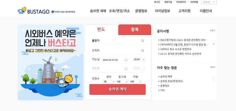 - 2단계: 같은 조건으로 버스타고에서도 다시 조회해 예매 가능 여부를 비교합니다.
